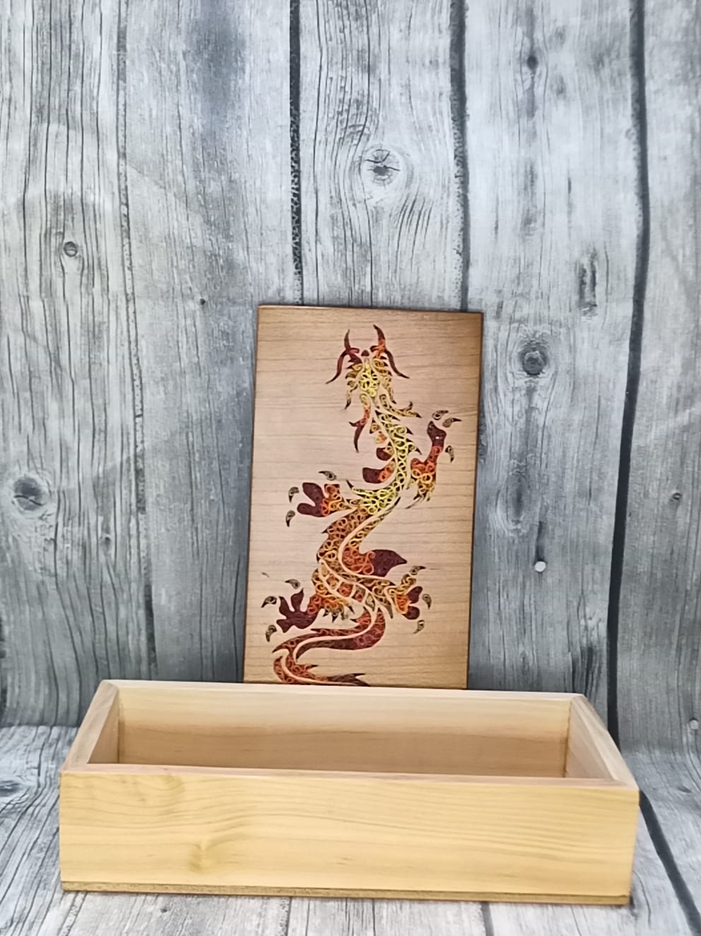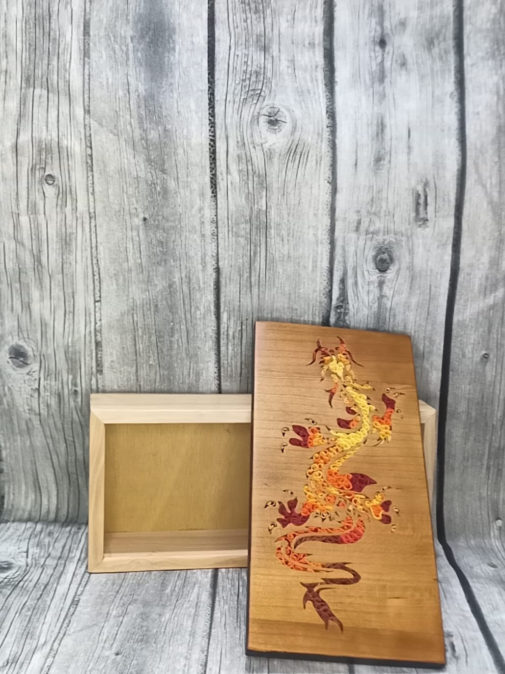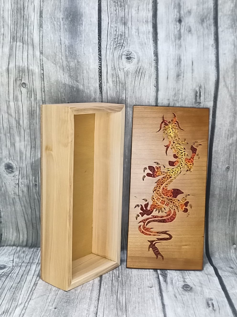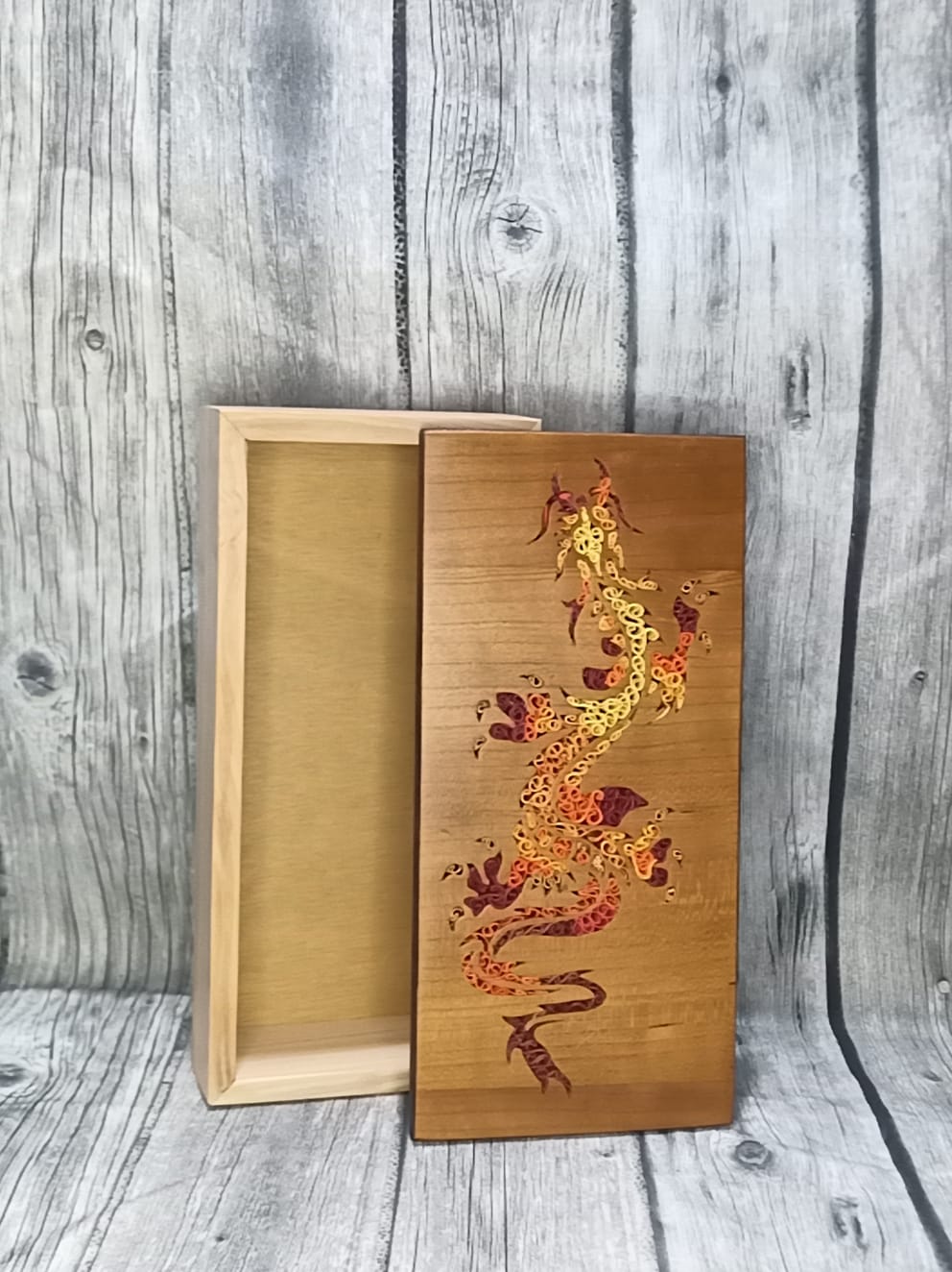 Boîte rectangulaire en bois massif vernie teinte incolore. Couvercle orné d’un dragon chinois découpé par chantournage et rempli à la main de paperolles selon l’art du quilling. Dimensions : Longueur 21,5 cm x largeur 10,5 x hauteur 6 cm.