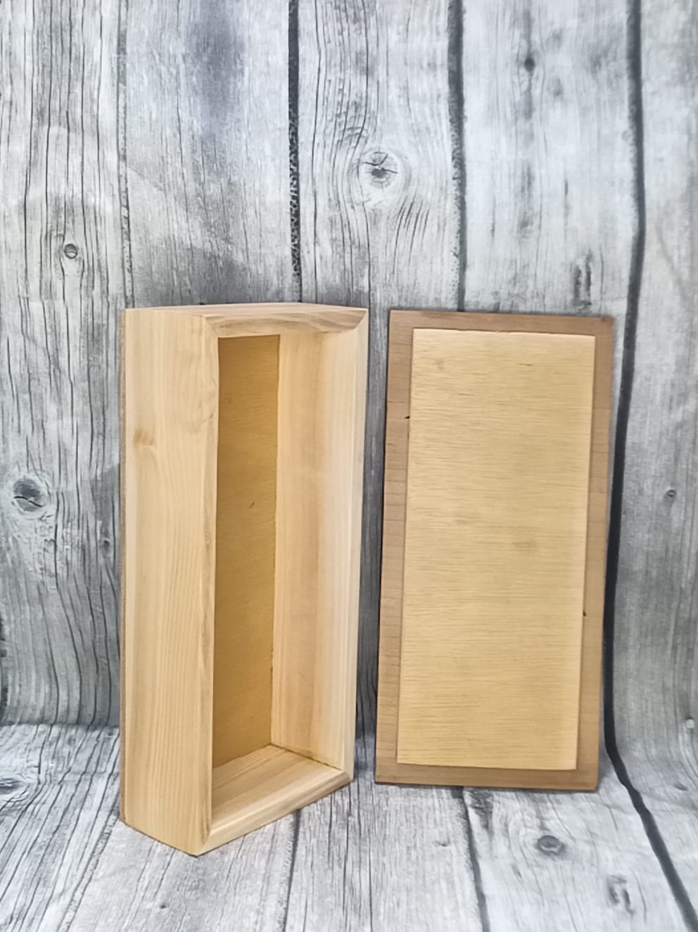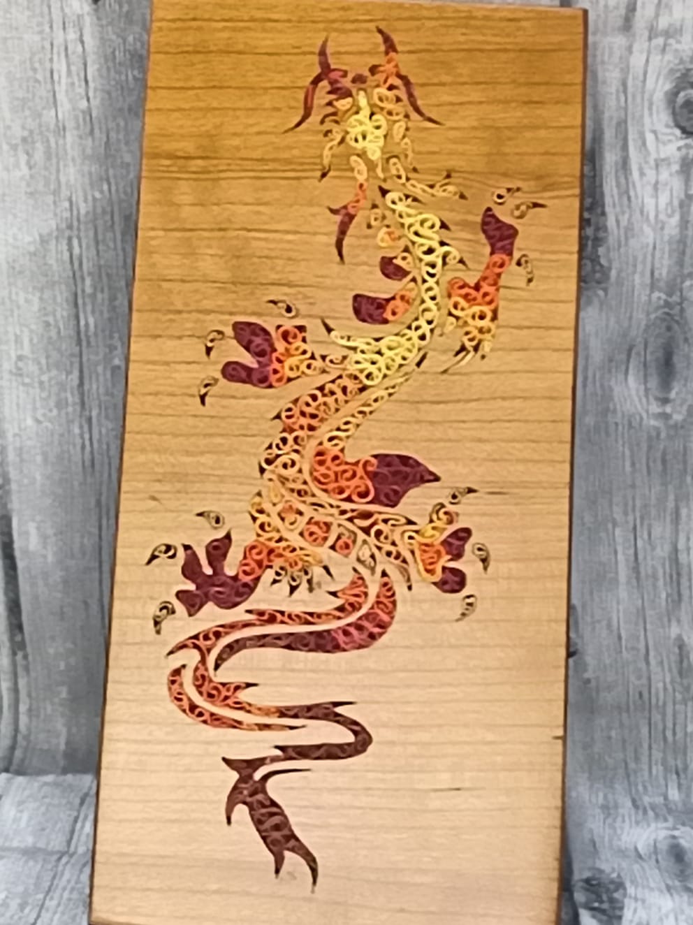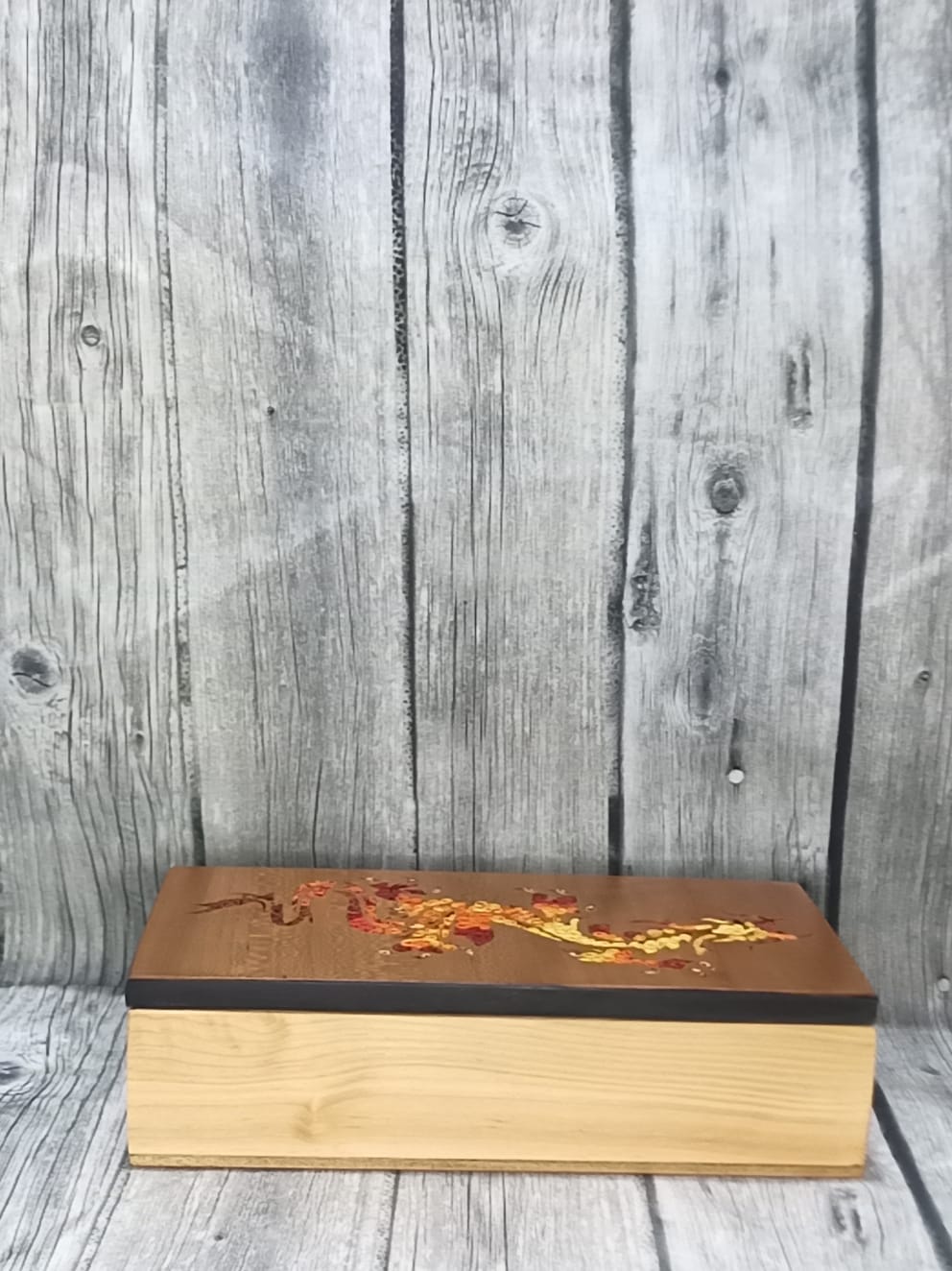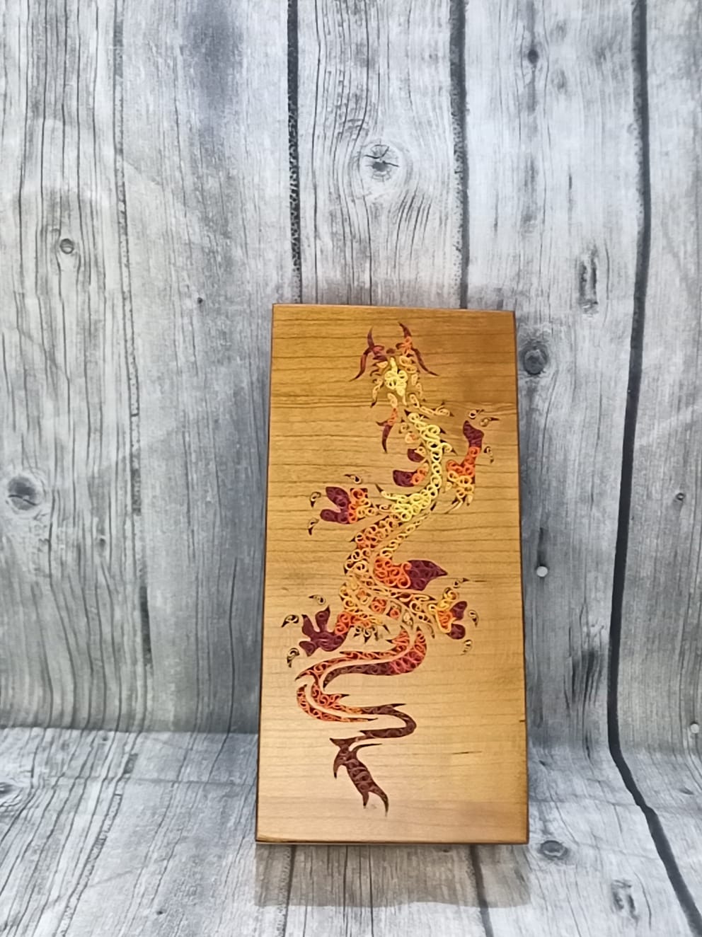 Boîte rectangulaire en bois massif vernie teinte incolore. Couvercle orné d’un dragon chinois découpé par chantournage et rempli à la main de paperolles selon l’art du quilling. Dimensions : Longueur 21,5 cm x largeur 10,5 x hauteur 6 cm.