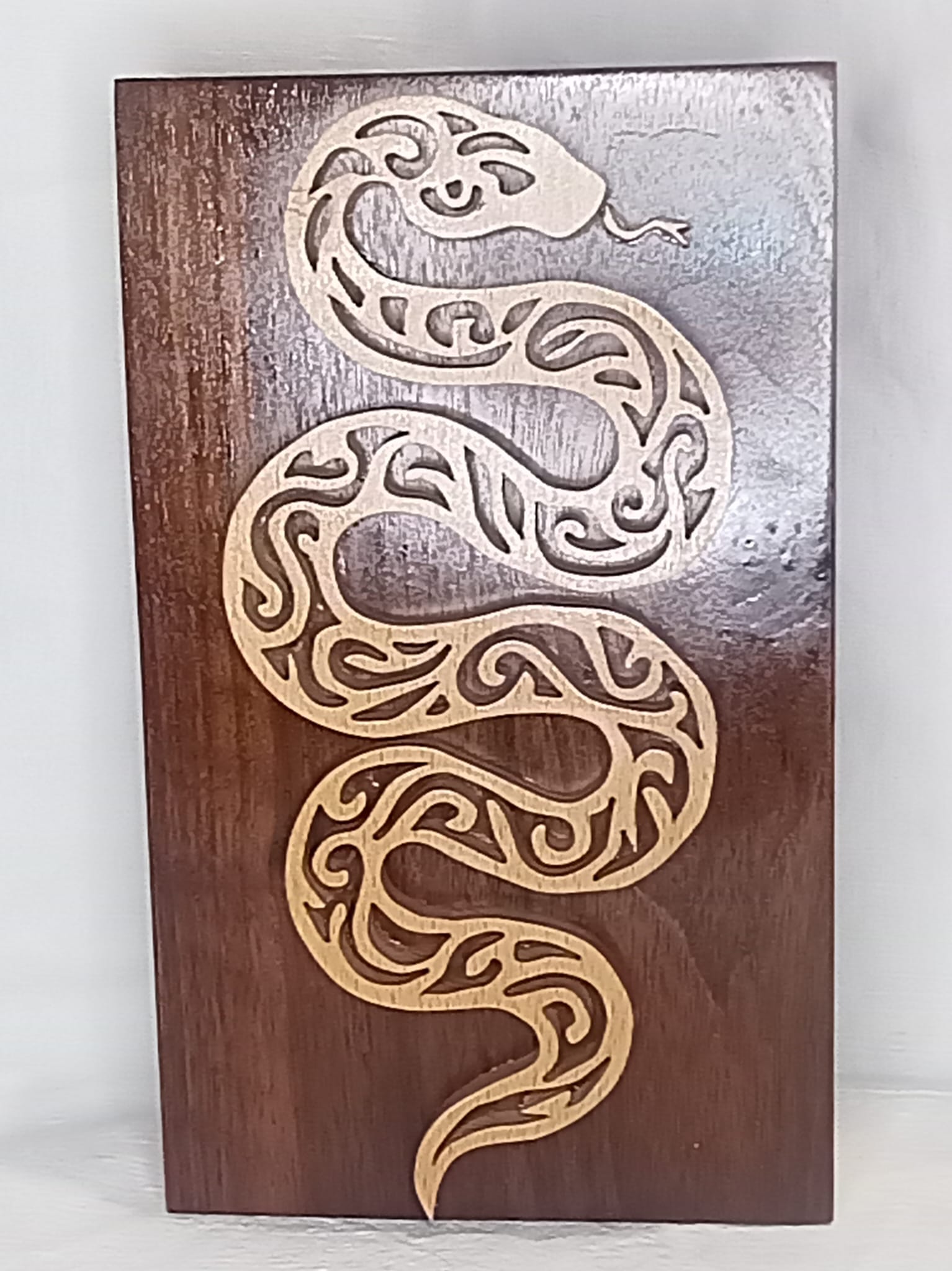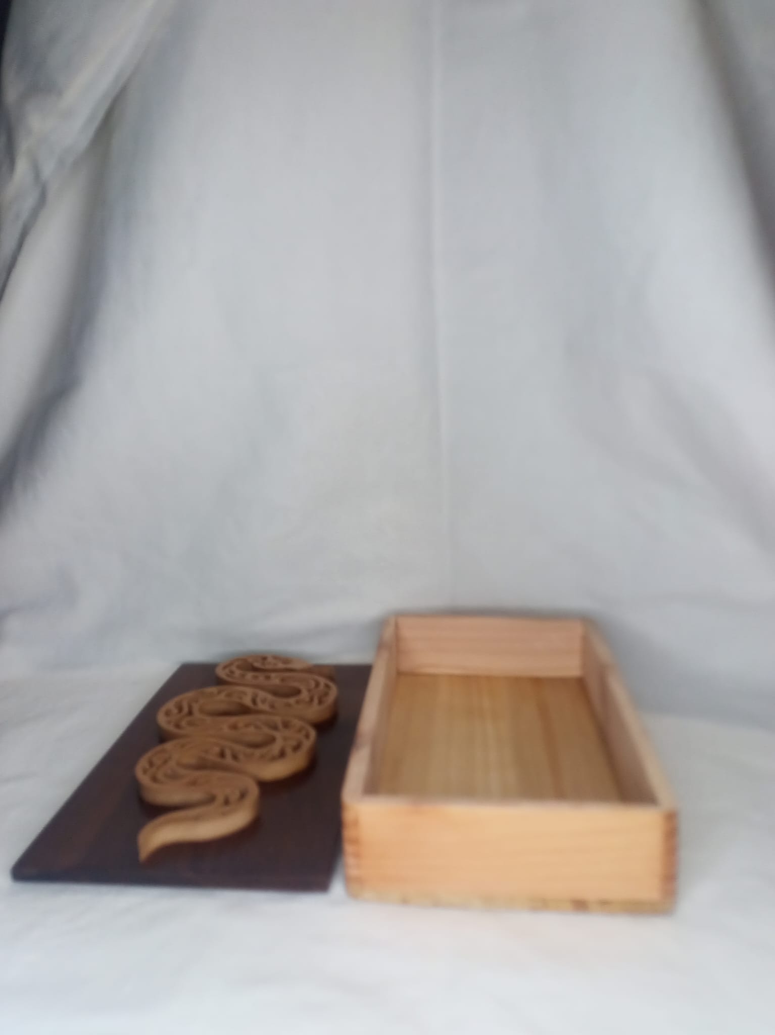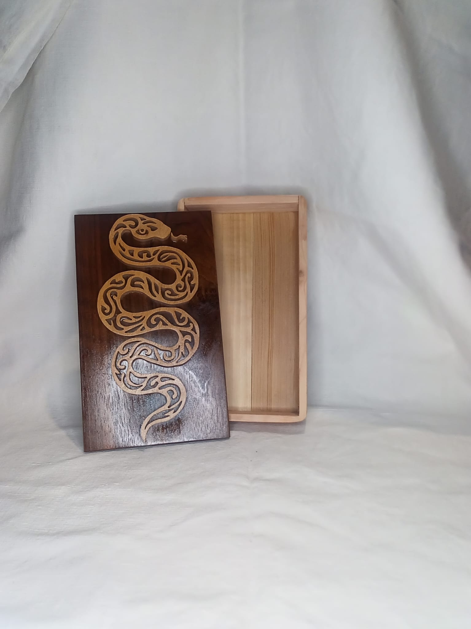 Boîte rectangulaire en bois massif vernie teinte claire. Couvercle verni teinte foncée et orné d’un serpent tribal découpé par chantournage et verni teinte claire. Dimensions : Longueur 25,5 cm x largeur 15 x hauteur 6 cm.