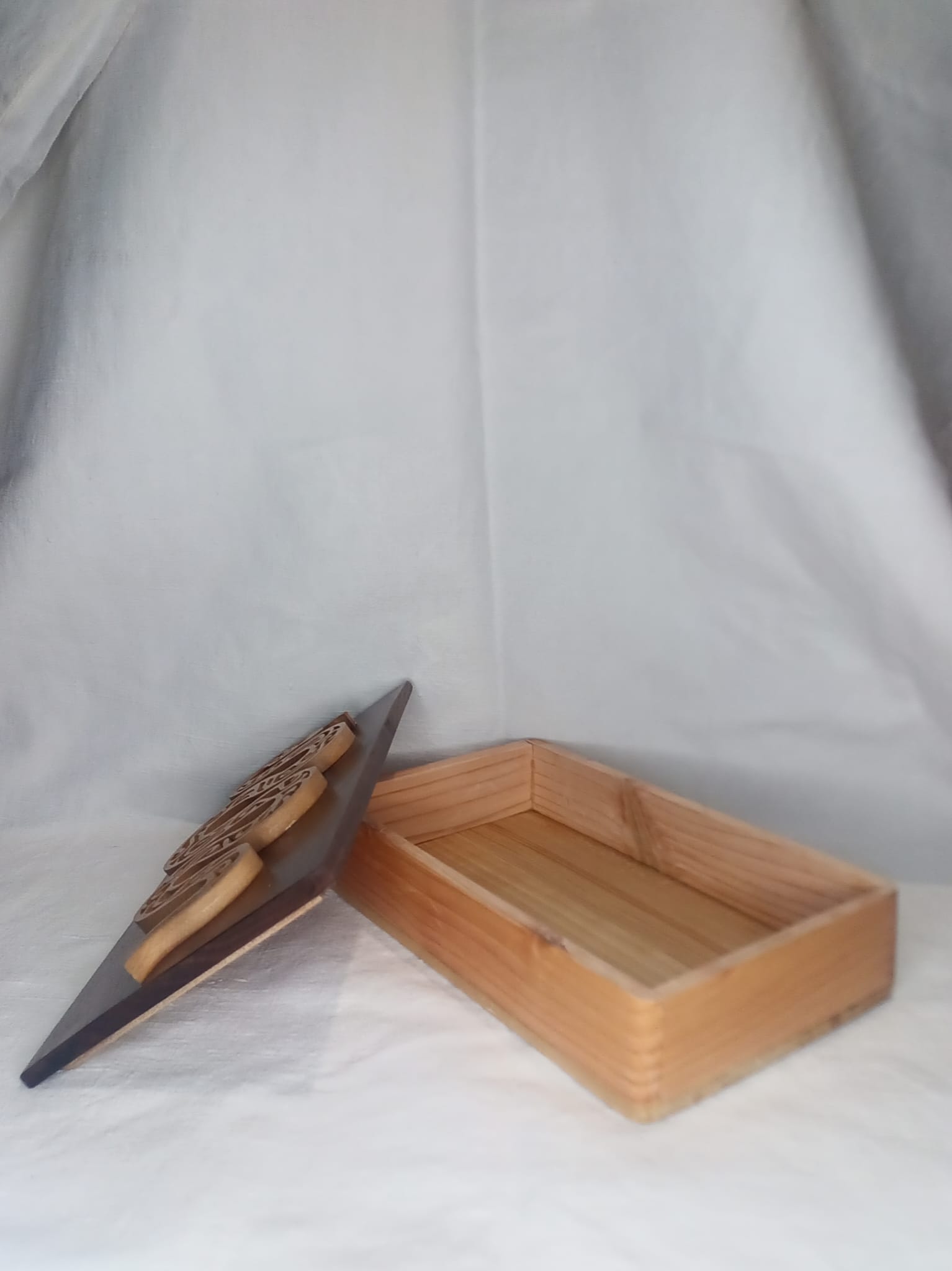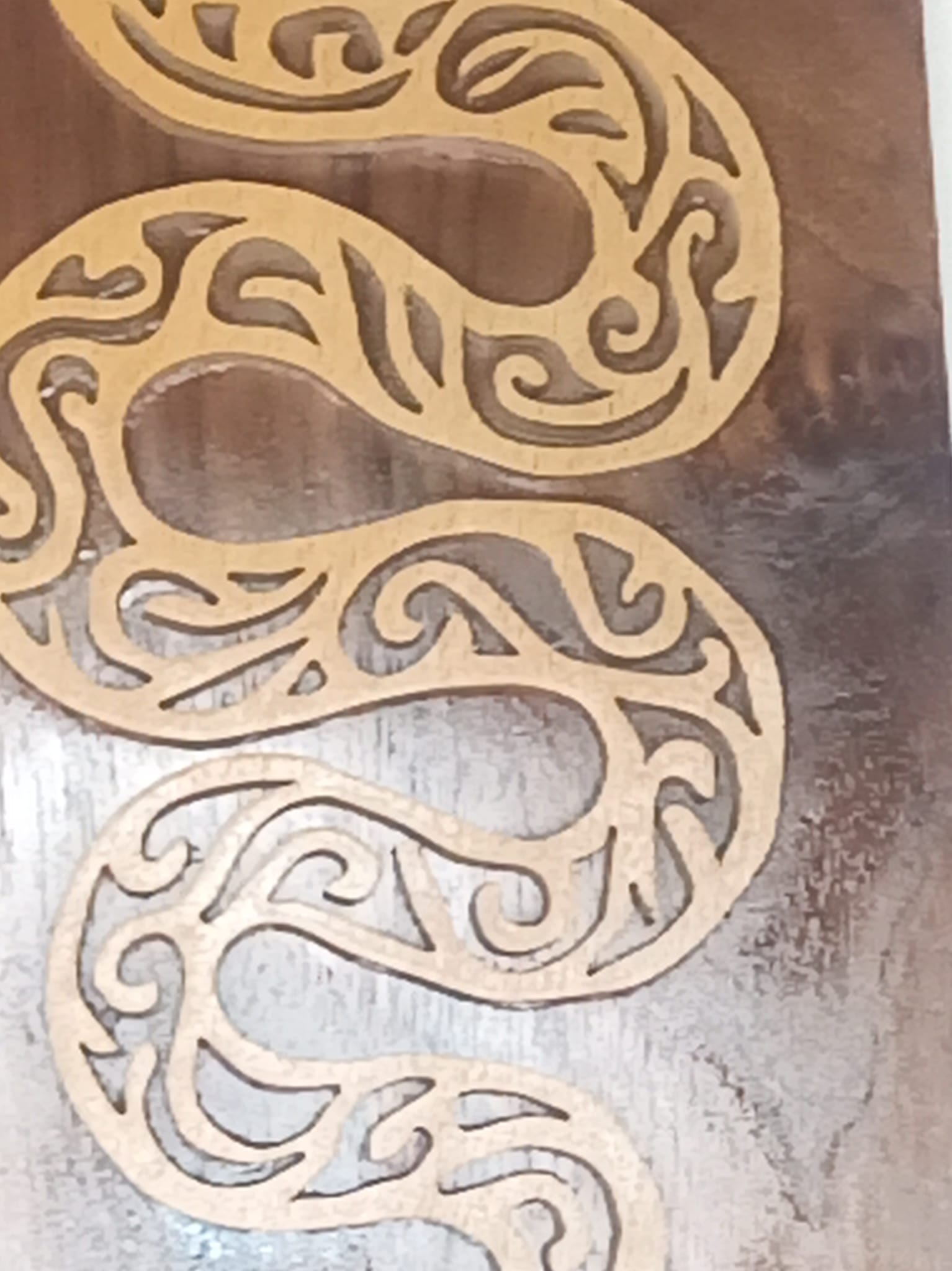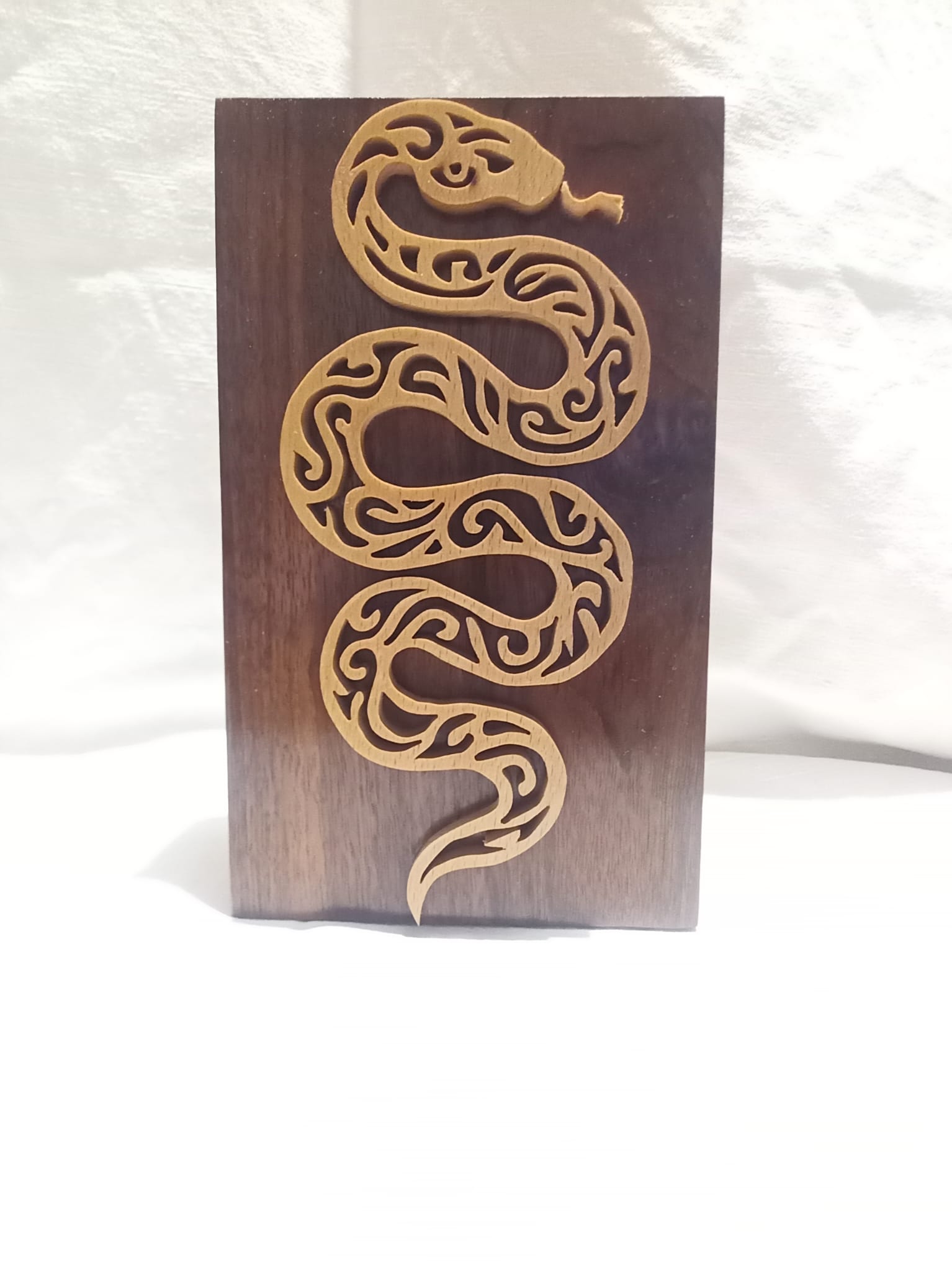 Boîte rectangulaire en bois massif vernie teinte claire. Couvercle verni teinte foncée et orné d’un serpent tribal découpé par chantournage et verni teinte claire. Dimensions : Longueur 25,5 cm x largeur 15 x hauteur 6 cm.