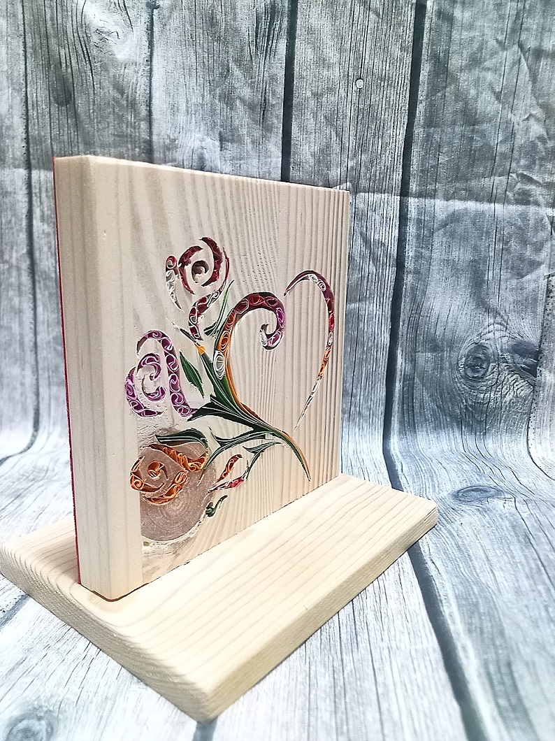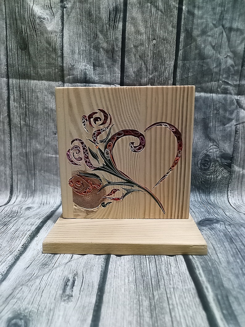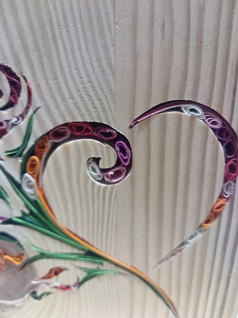 Le cœur et les fleurs sont découpés dans le support carré par chantournage et rempli de paperolles (technique du quilling) pour mettre en valeur et colorer l’ensemble.