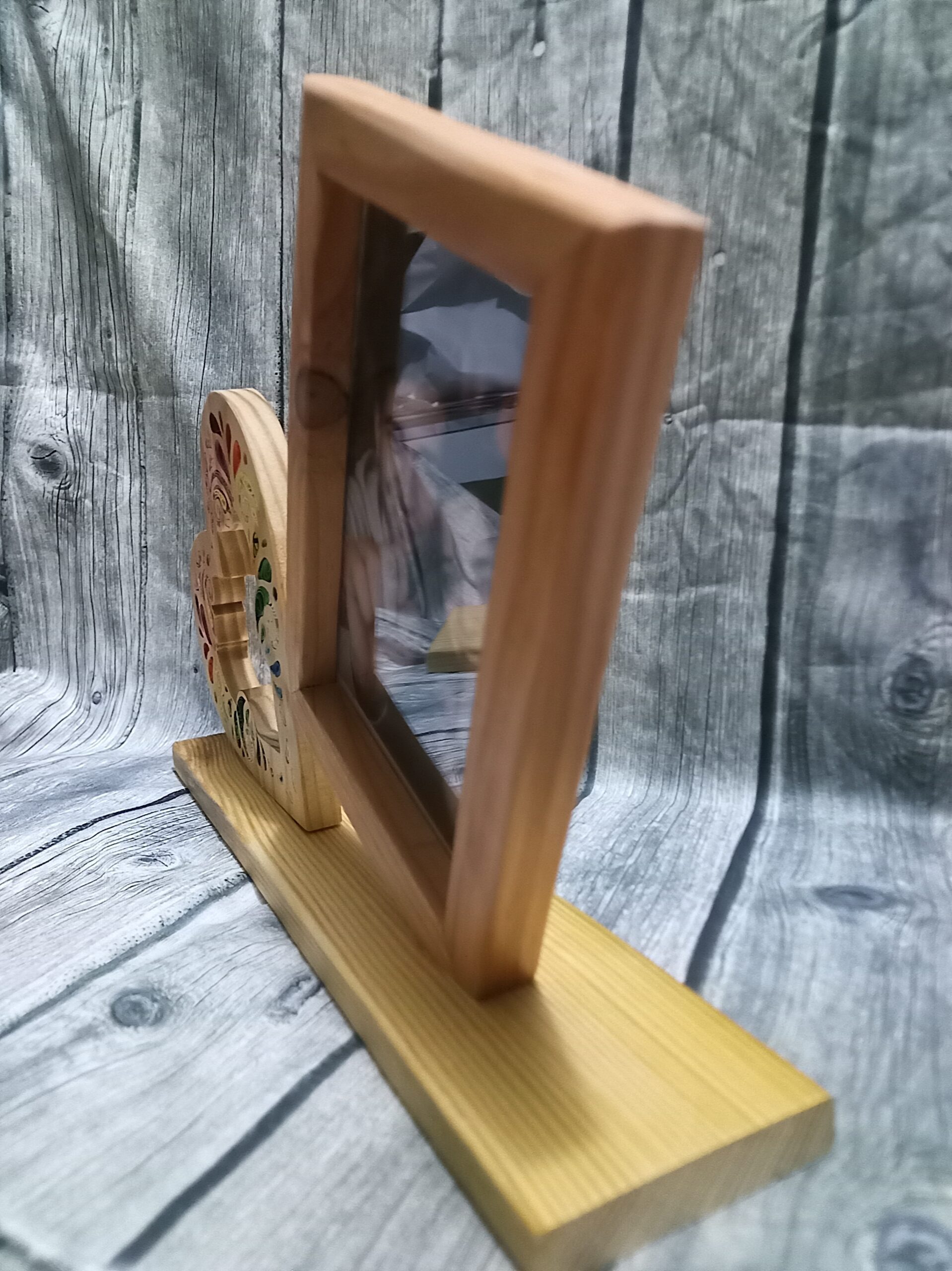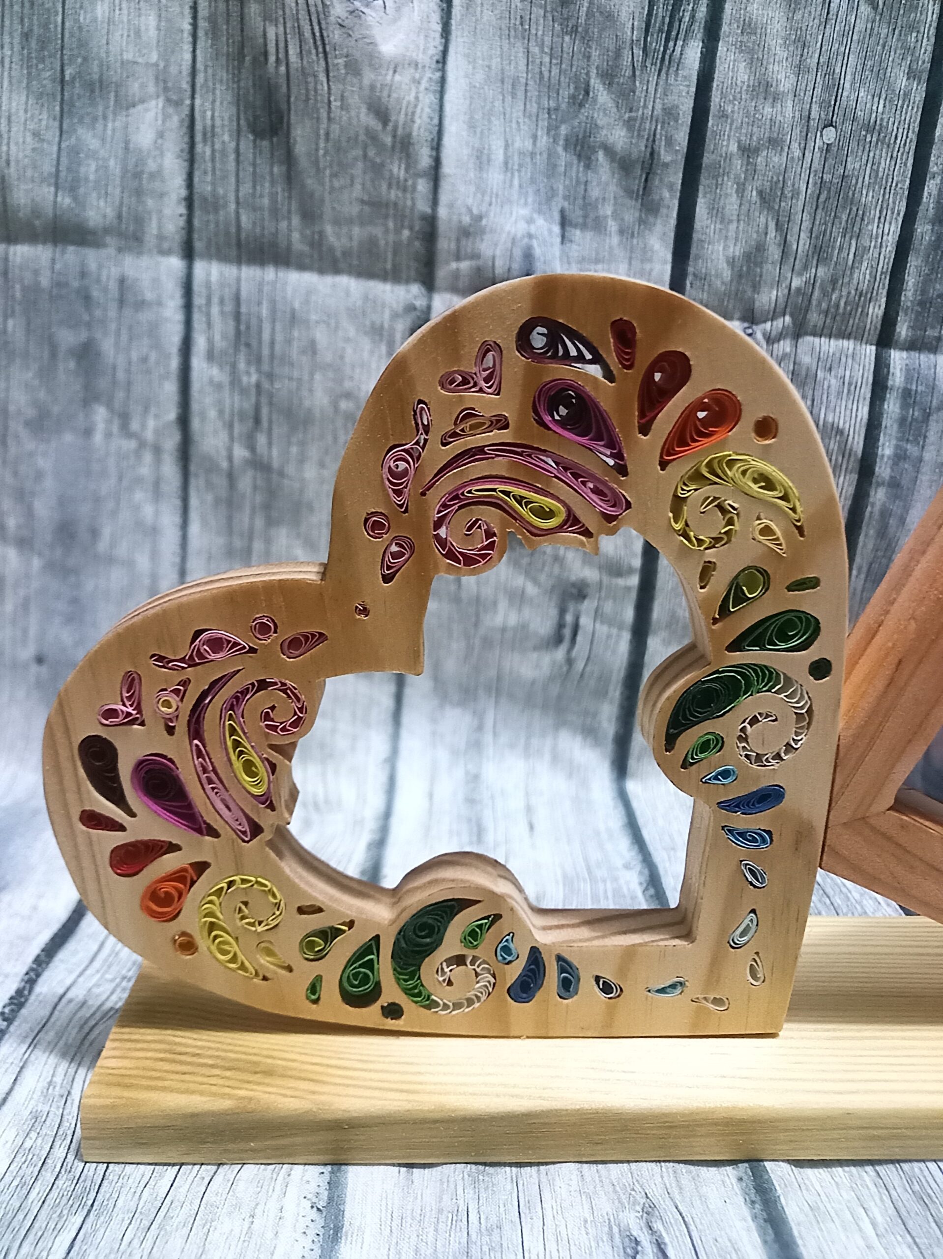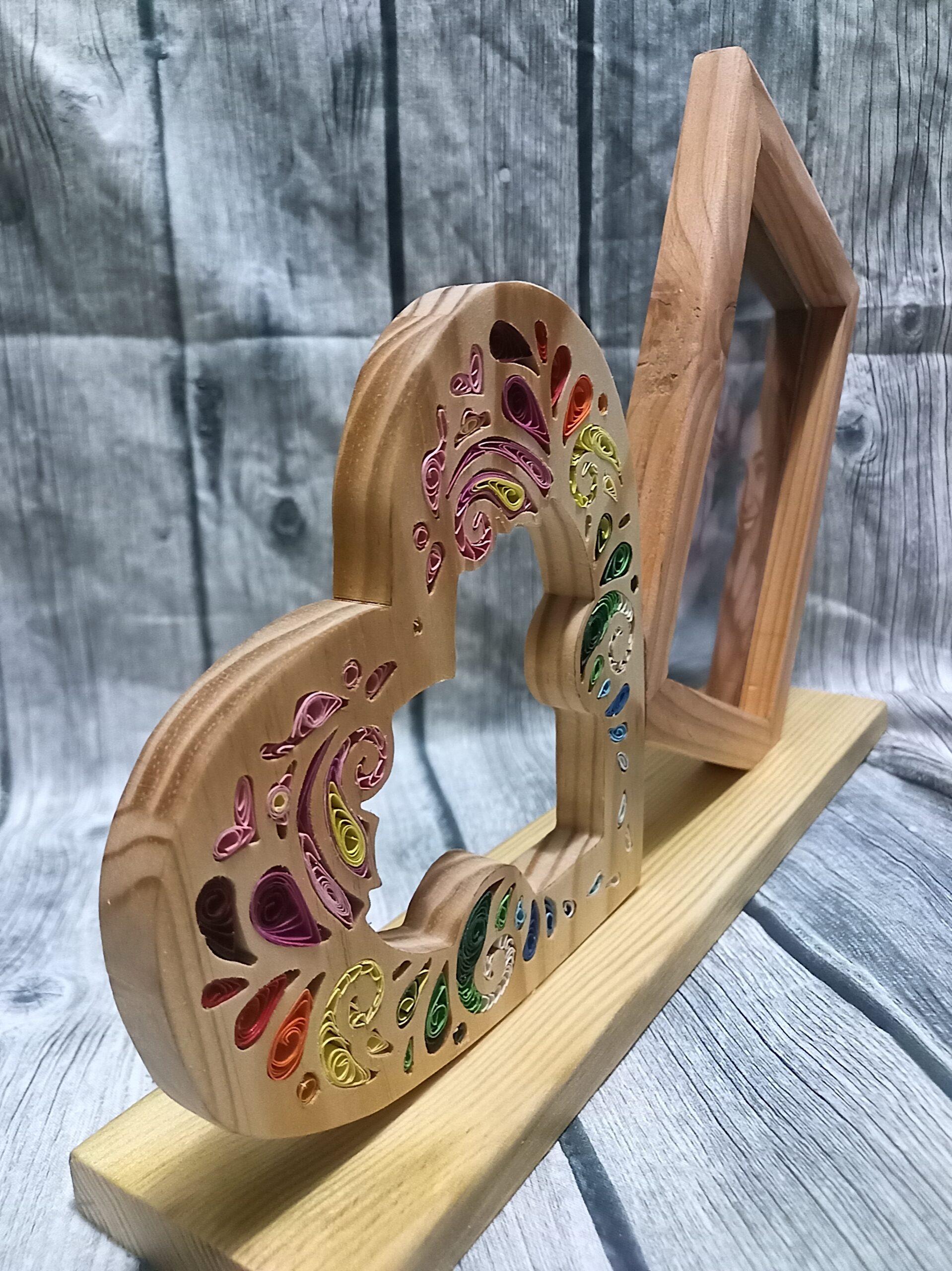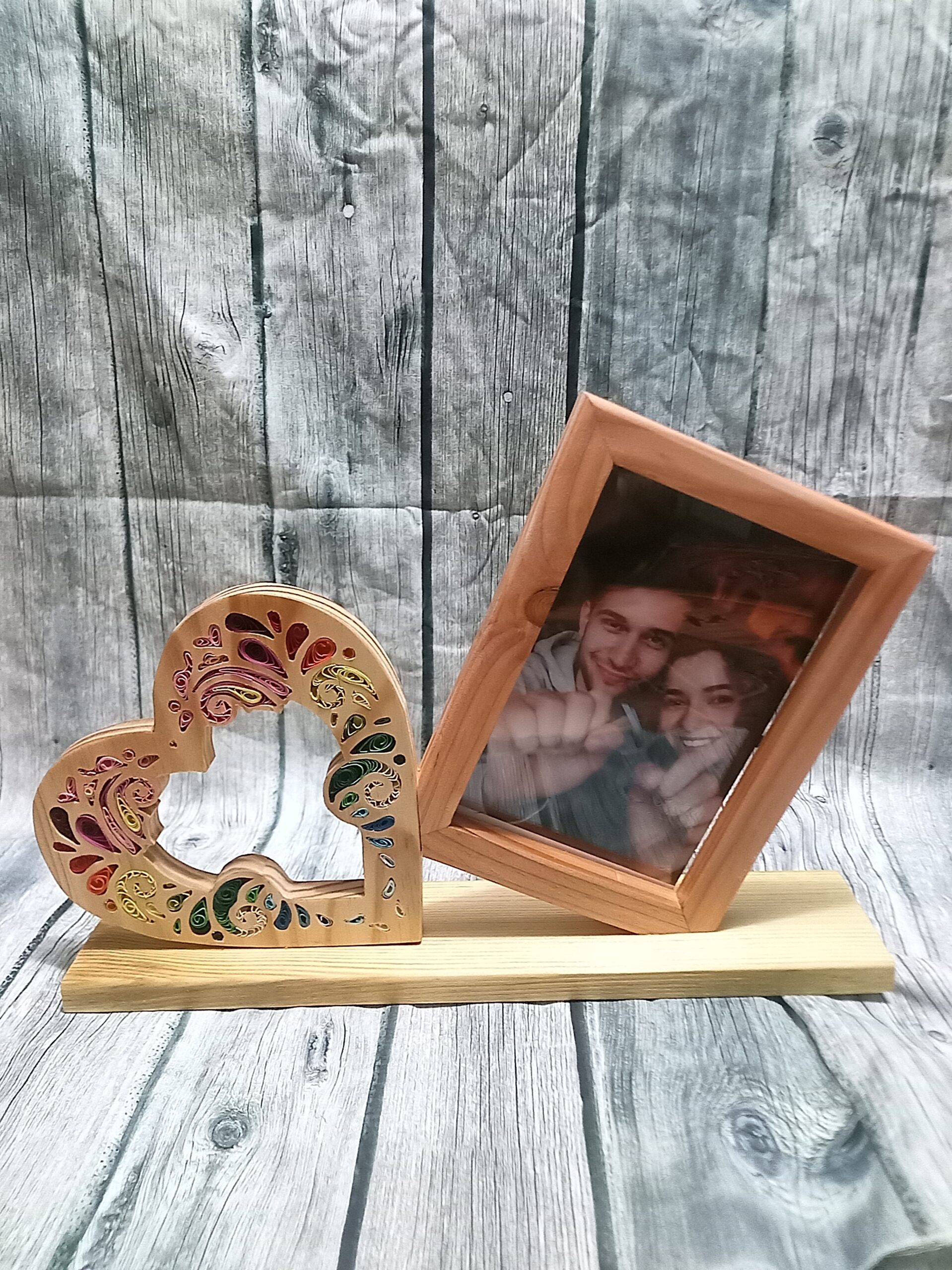Ce cadre photo bois quilling se compose d’un cadre pour photo 10 x 15, d’un socle et d’un cœur tout en bois massif.
