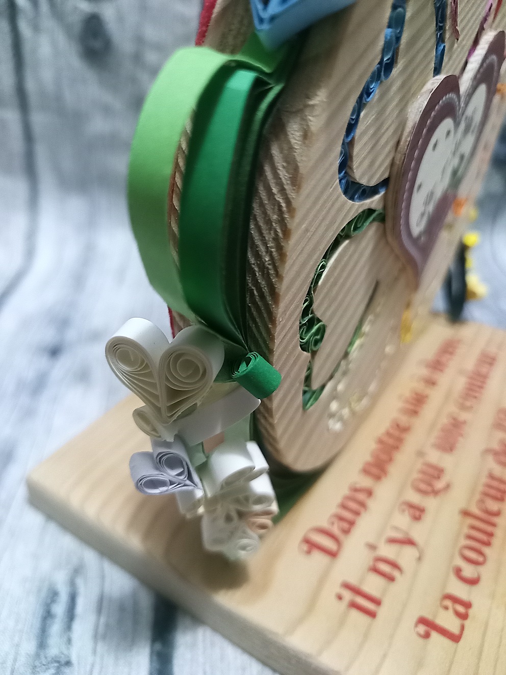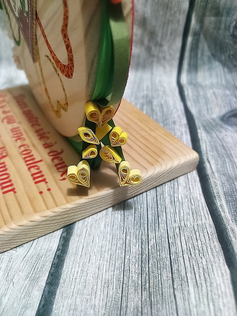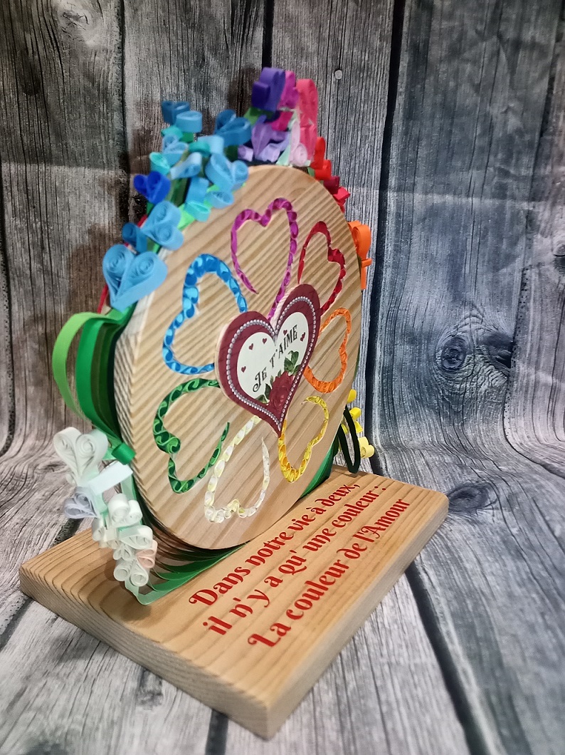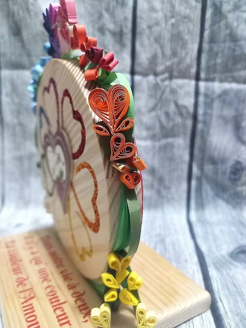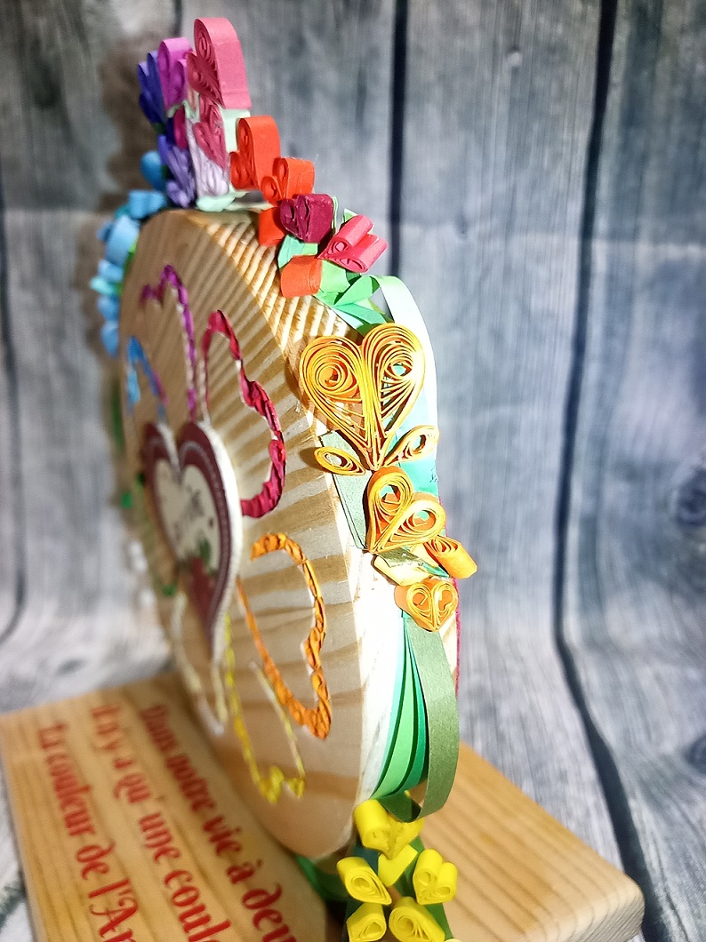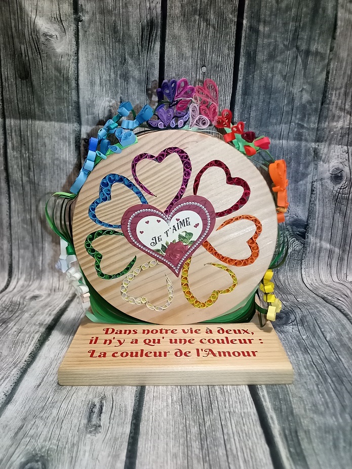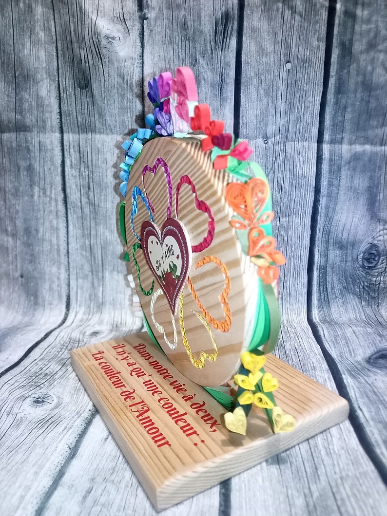 Les cœurs découpés par chantournage forment une fleur où chaque cœur rempli de paperolles (technique du quilling) d’une couleur différente représente un pétale de la fleur.