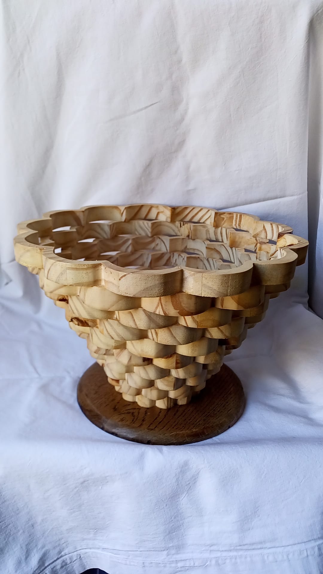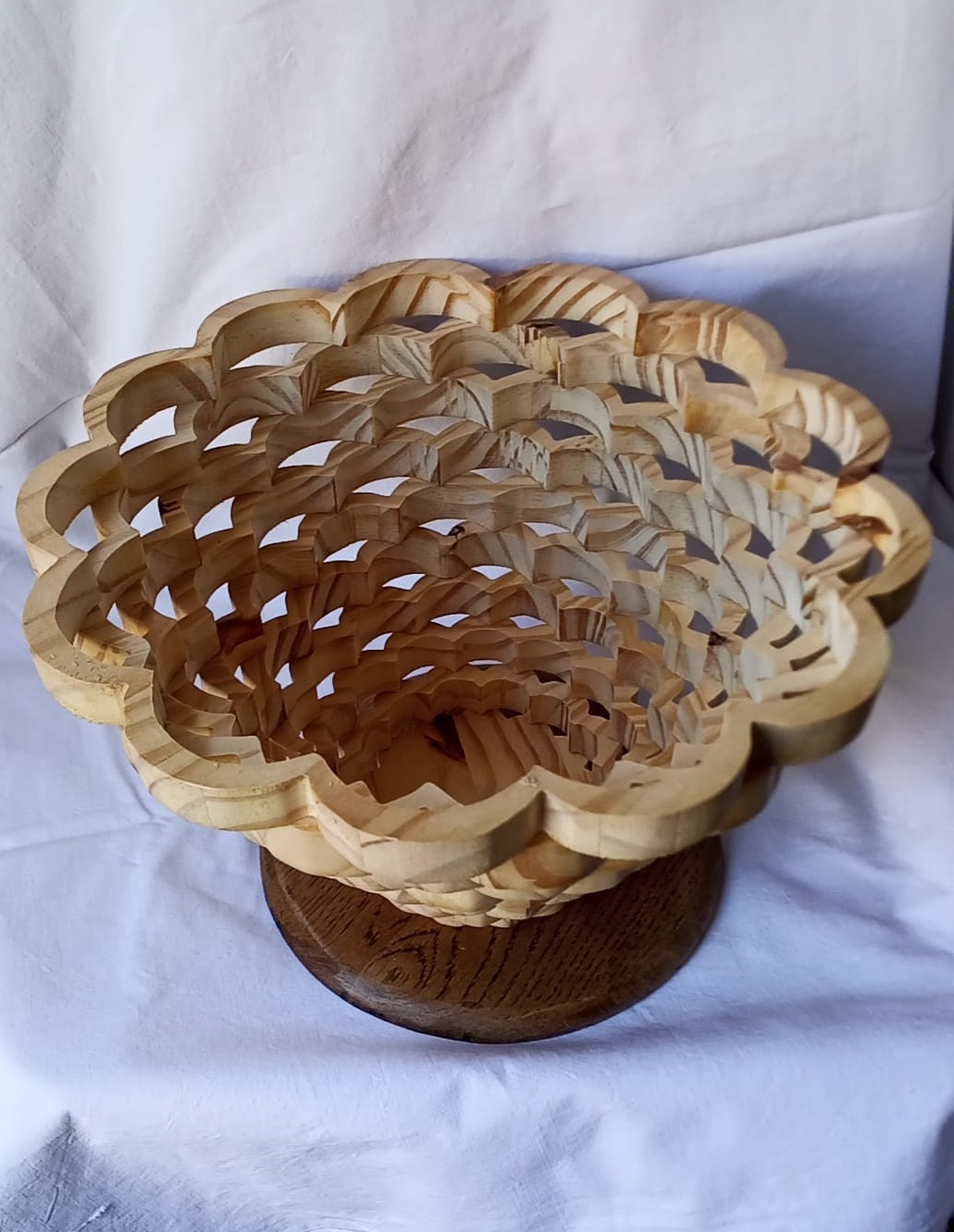 Grand panier en bois massif naturel chantourné avec effet vagues décalées d’une rangée sur l’autre et pose sur un socle teinte foncée. Dimensions : diamètre 19 cm x hauteur 28 cm.
