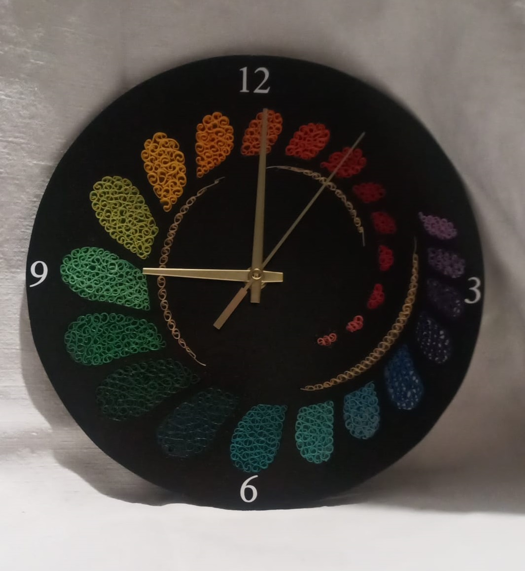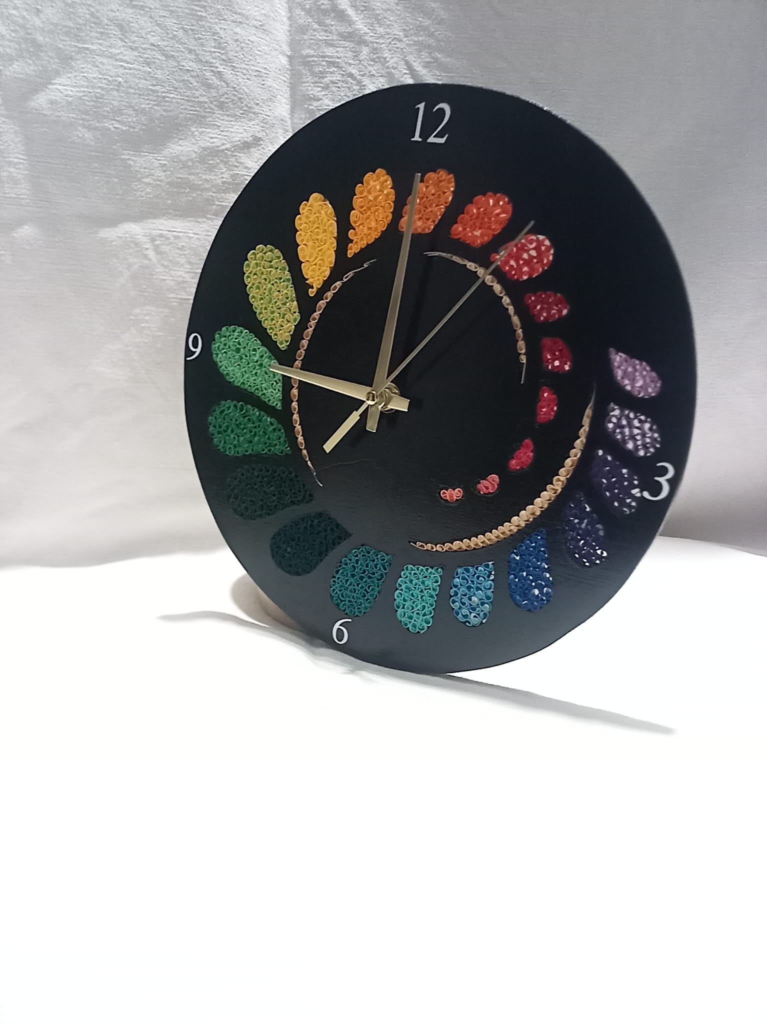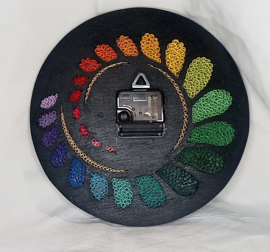 Pendule ronde en bois massif peinte en noir avec des formes découpées par chantournage et remplies de paperolles (selon l’art du quilling) dans un dégradé de couleur allant du rose au violet en passant par le jaune et le bleu. Pendule à système automatique fonctionnant avec une pile AA (non fournie). Dimensions de l’ensemble en cm : 26 (diam) x 2,5 (P).